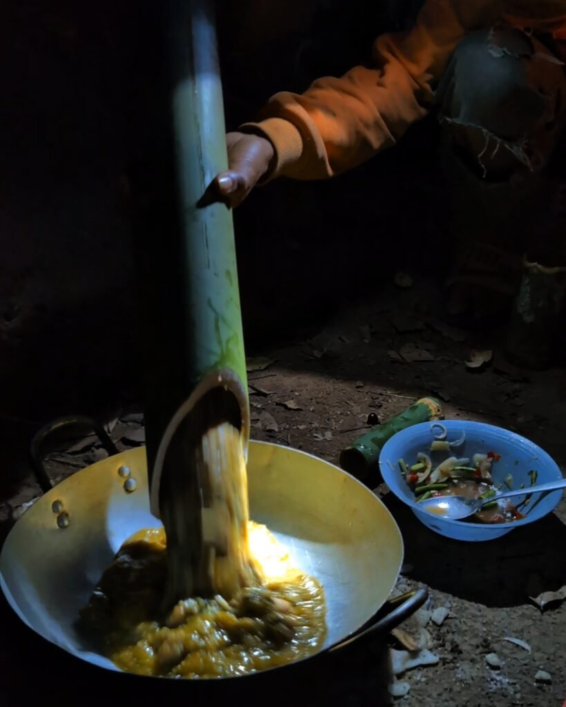 The rangers and guides made a fantastic dinner of a pickled spicy salad, rice, and bamboo soup (a coconut, pumpkin, meat and spices soup cooked inside a large tube of bamboo, cut from the jungle that evening and placed directly into the fire). We were a bit nervous, but the food was delicious, the guides could certainly have careers as cooks if they so wished, and we were told one was the village cook for big events!